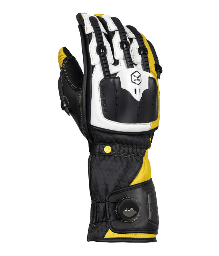 Due to its innovative futuristic look the award winning Handroid glove is the most striking design of motorcycle glove ever made. The design includes features such as the Scaphoid Protection System as well as the eye-catching exo skeleton finger spines, which cover the tops of the fingers for impact protection as well as a unique Boa closing system which always ensures a perfect and secure fit.