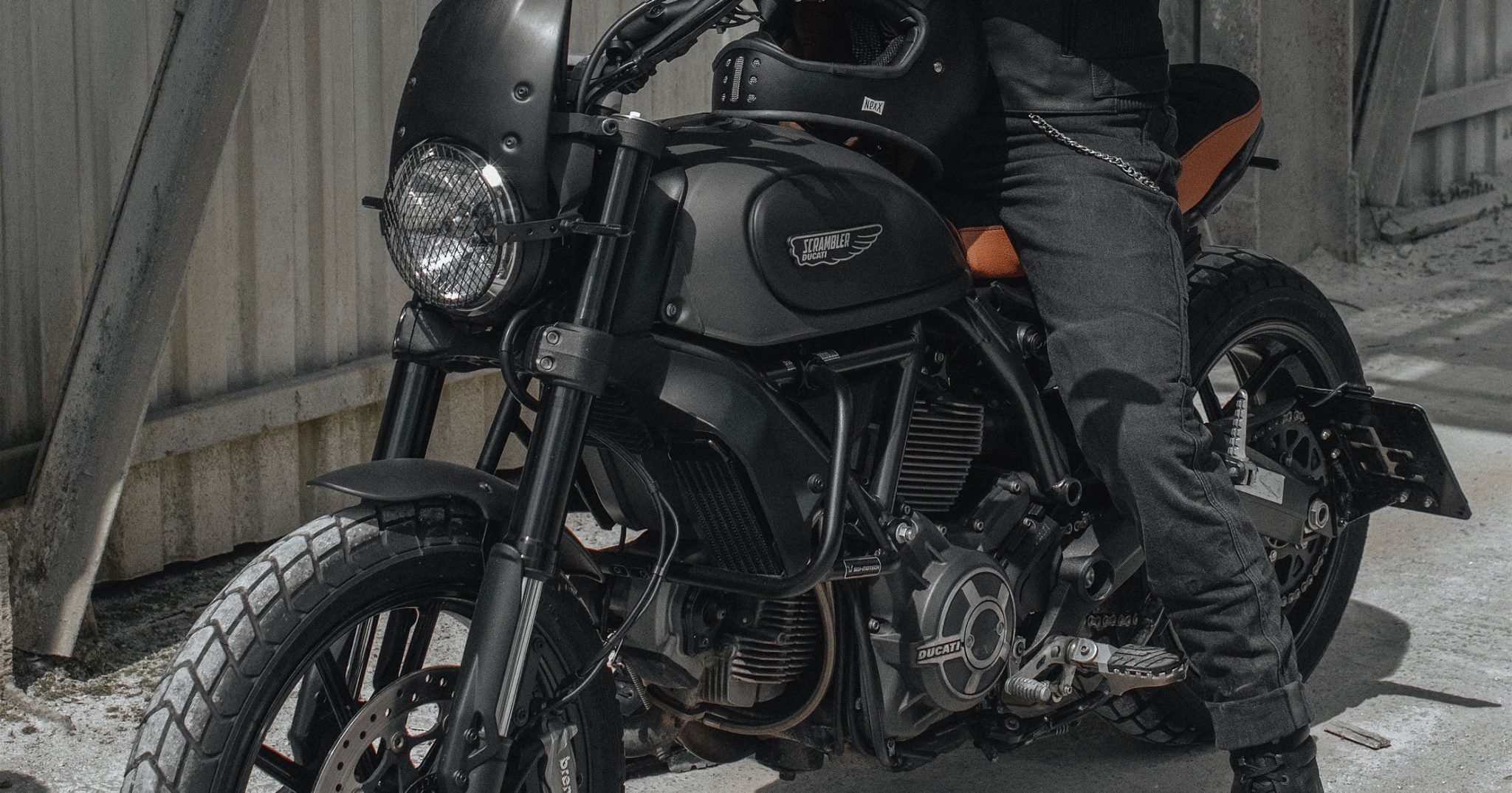 - Slim-fit motorcycle pants with armor. Regular waist, classic five-pocket jeans design