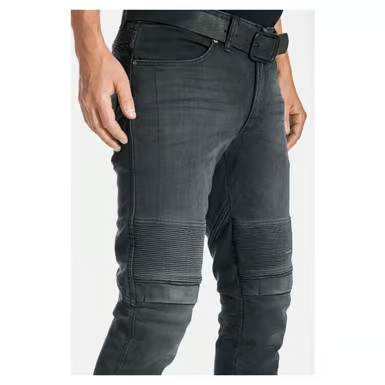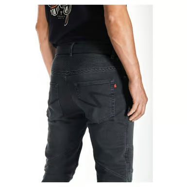 Dynamic and versatile, the KARL DEVIL 9 has been engineered with your safety in mind. Ultra-durable 12oz CORDURA® super-stretch denim is combined with COOLMAX® technology for unparalleled wearability and optimal protection in all weather conditions. The lining is made of thick interlock-knit DuPont™ Kevlar® fibers. The unique hand-made aging on the fabric’s exterior gives these slim-fit black jeans their characteristic washed look. With the knee armor accessible from the outside, you’ll also find hand-made stretch panels on the knees and back for extra comfort.