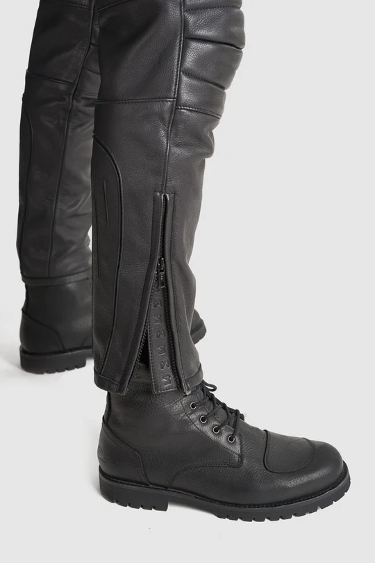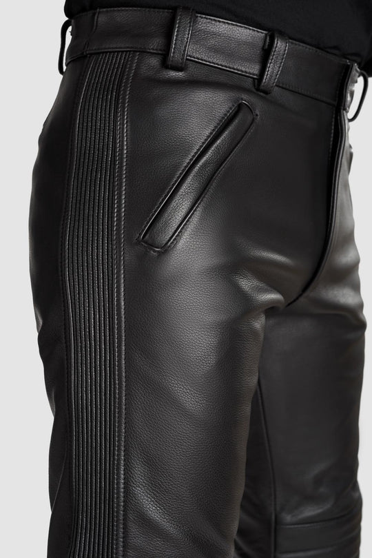 • Men’s leather trousers inspired by both past and future. Made of black 1.2mm thickness cow super milled leather