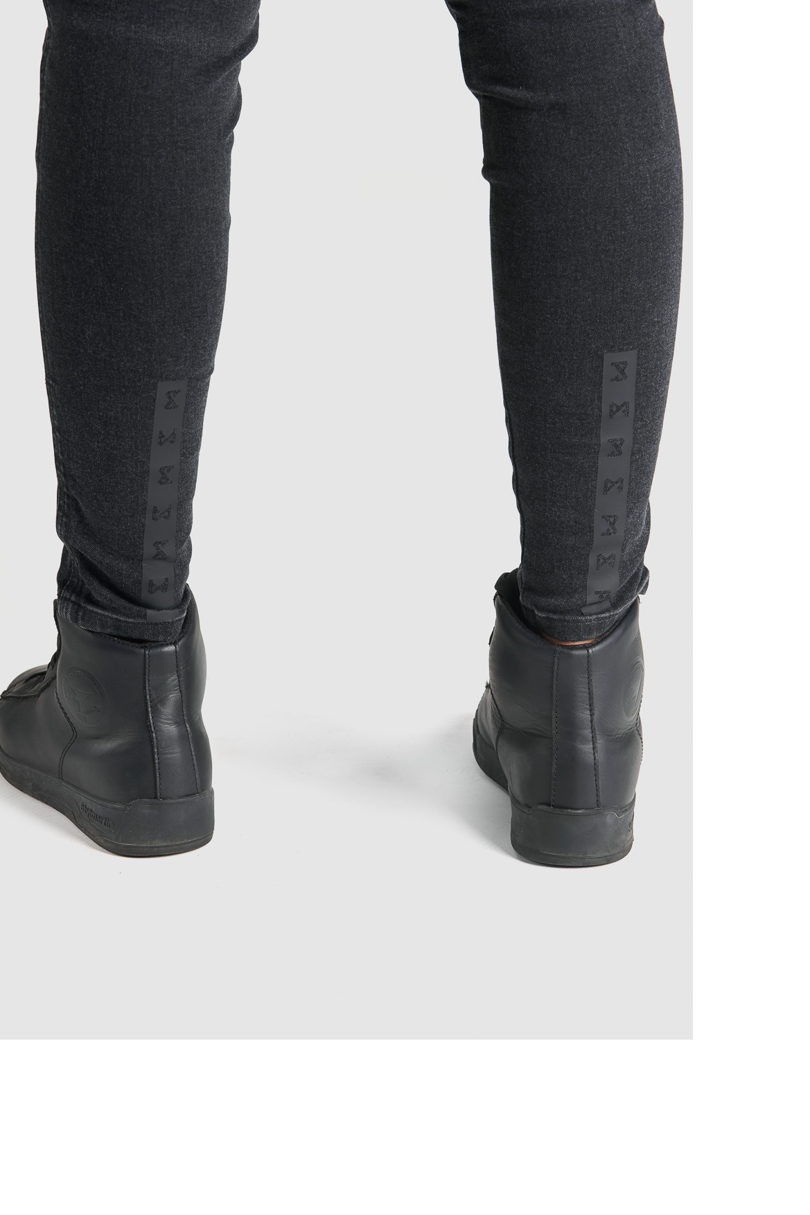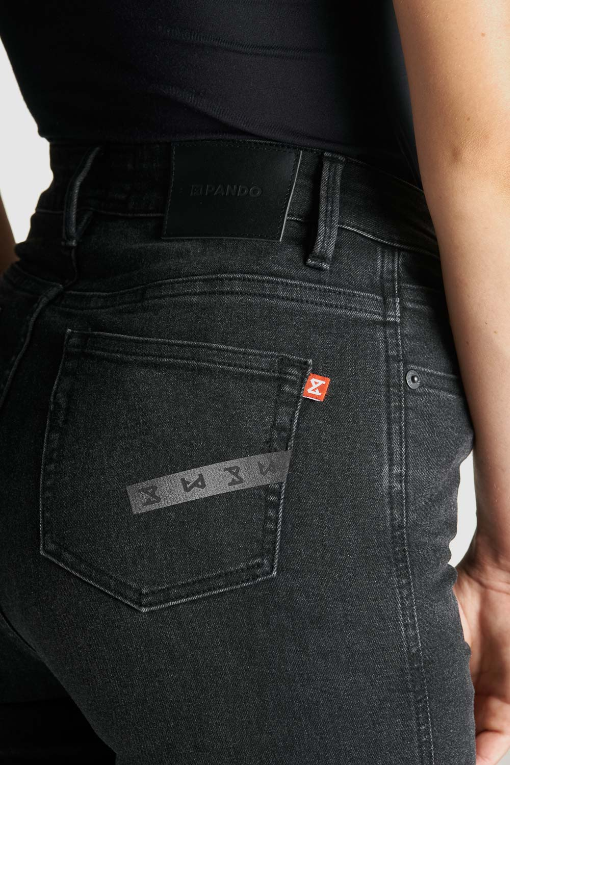 Slim-fit armored motorcycle jeans for women with all the protection you expect from Pandomoto’s riding gear. KUSARI KEV 02 is made of 9 oz heavy-duty power-stretch waxed denim, combining maximum comfort and superior safety. Rock the skinny look with jeans that are durable, versatile, and stylish. Sleek and unfussy, this garment has discreet embroidery on the front with Pandomoto’s crown logo. Enjoy extra peace of mind thanks to the protective DuPont™ Kevlar® lining reinforcement in high-risk abrasion and impact zones. Features two-position knee armor pockets and extra stretch panels on the knees.