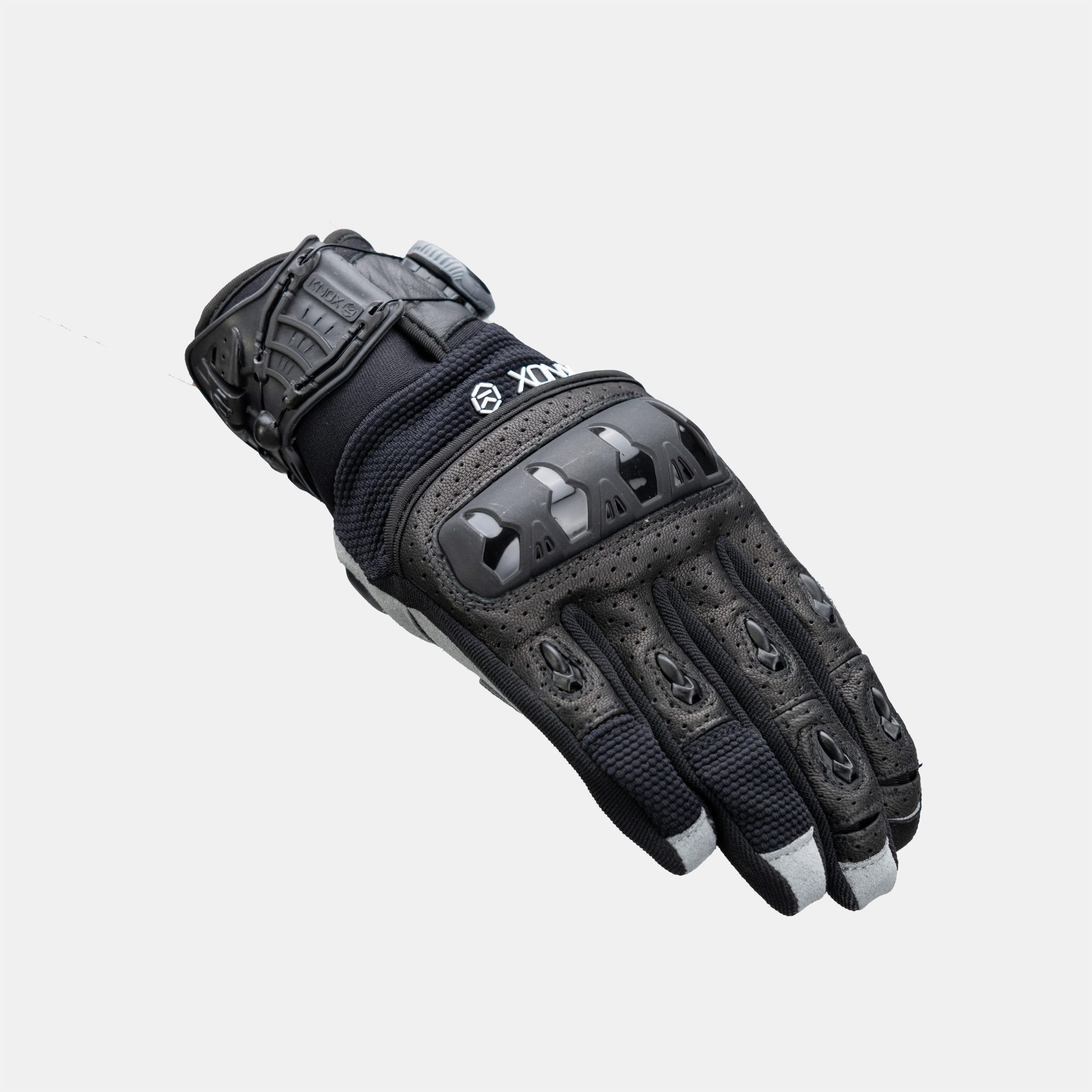 • Patented low profile Knox Scaphoid Protection System (SPS) on the palm (Patent No EP1594378) to eliminate the grab effect that occurs when a leather palm makes contact with the road, reducing the risk of hyper extension which can be the cause of a broken scaphoid