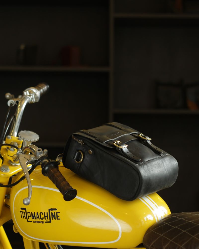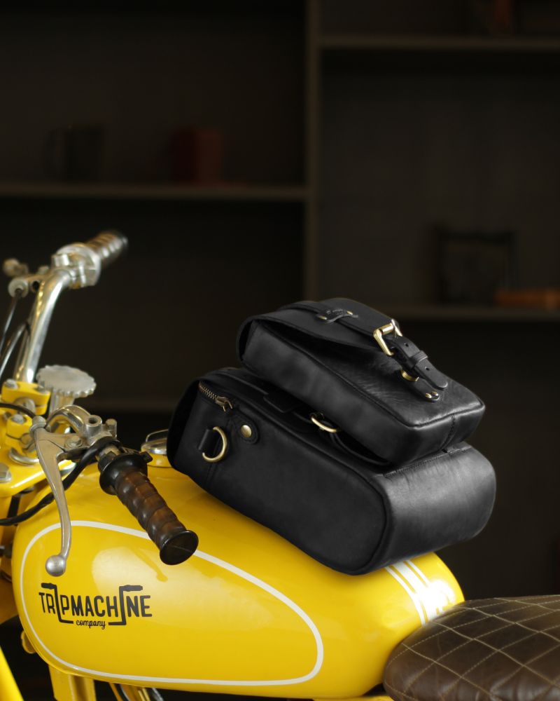 We've consistently been impressed by the exceptional quality of the handmade leather goods from Trip Machine's workshop in New Delhi, and their Mini Pannier is yet another standout product for us. Crafted from top-notch 100% leather that's been vegetable-tanned and given a nubuck finish, the real charm of this bag lies in its adaptability. It's the ideal size for carrying your essential items, functioning seamlessly as both a practical motorcycle pannier and a stylish shoulder bag when you're off the bike. Whether it's a disc lock, a set of tools, a jumpstart pack, or just your lunch, this bag has got you covered for anything you need on the road. The roll-top closure allows for some flexibility in size and secures with a leather strap and brass buckle. Attaching it to your bike is a breeze with the two leather straps and buckles at the back, designed to fasten onto your bike's sub-frame. Inside the bag, you'll find two loops with clips and Nylon straps that can be fixed to your bike and clipped onto one or both of the lower brass mounting rings to prevent the bag from swinging out when you're leaning into turns. If your bike has a dual rear shock setup, you can rest the pannier against one of the shocks to keep it from swinging into the rear wheel. Otherwise, a luggage rack might be necessary. For those times when you need quick access to smaller items without rummaging through the main compartment, the external front pocket is incredibly handy.