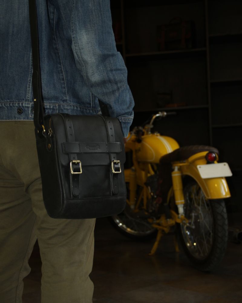 • An included leather shoulder strap for easy carrying off the bike
