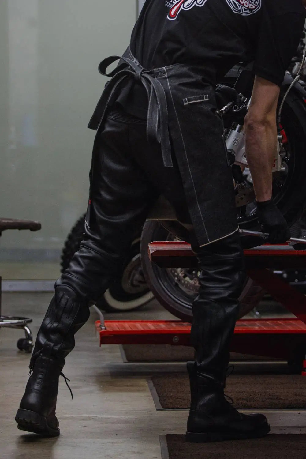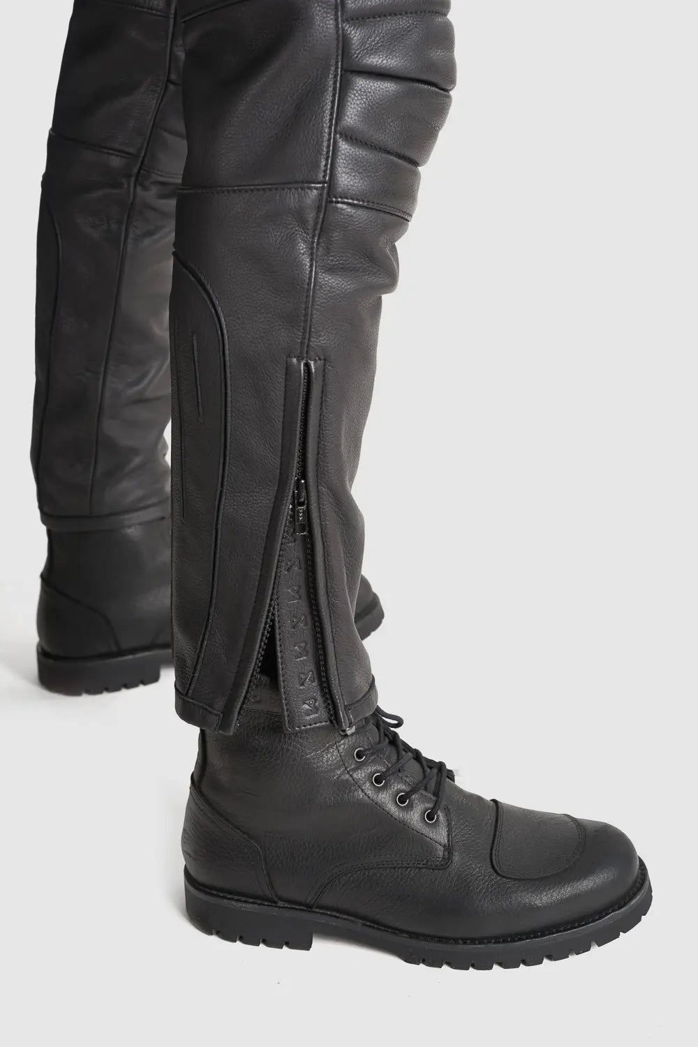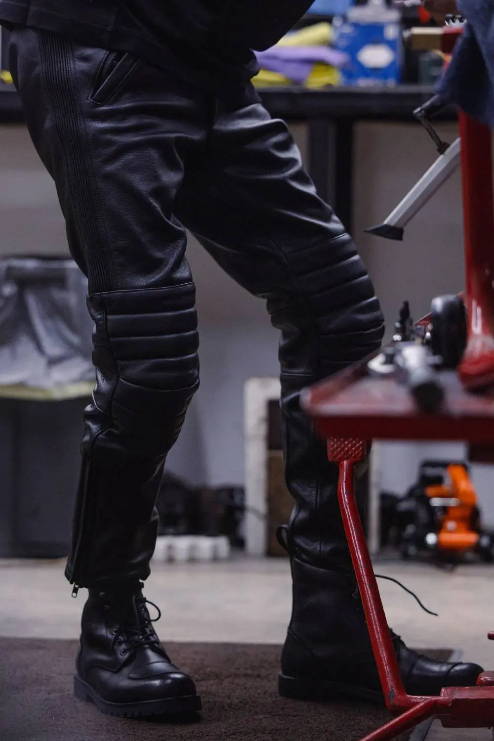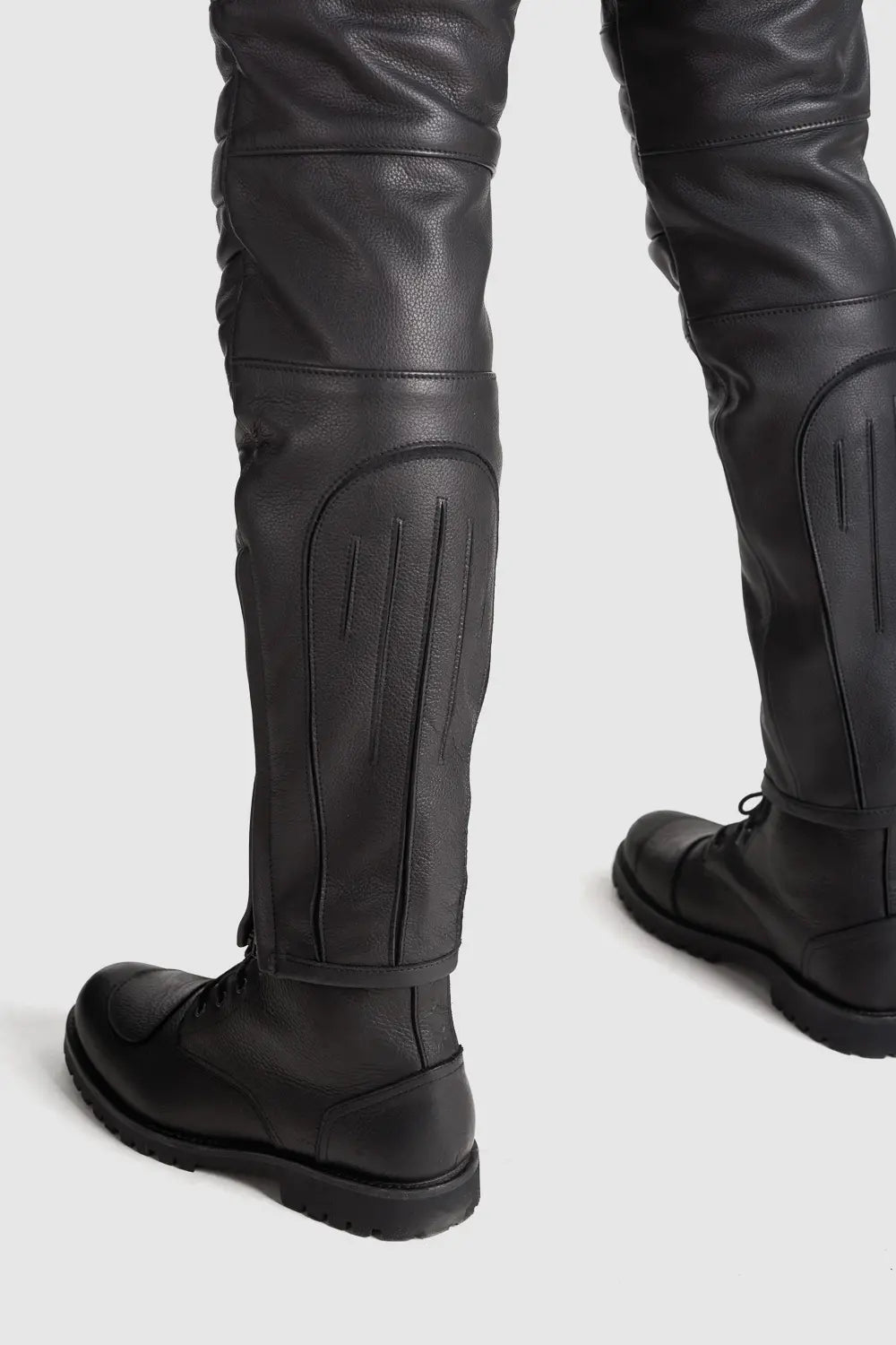 - Men’s leather trousers inspired by both past and future. Made of black 1.2mm thickness cow super milled leather