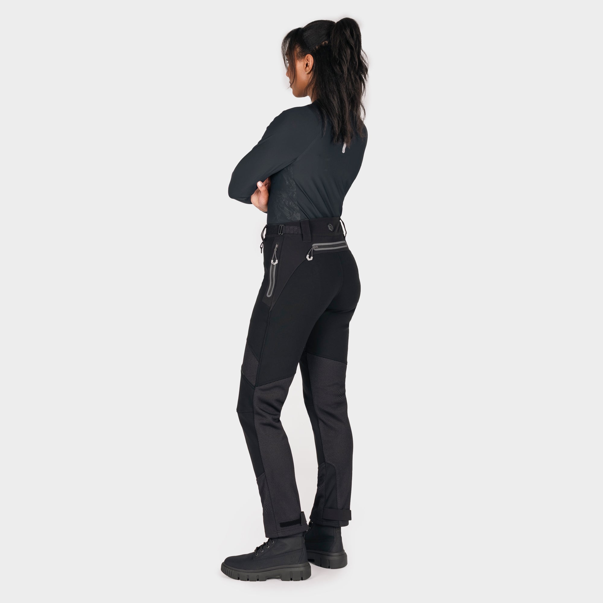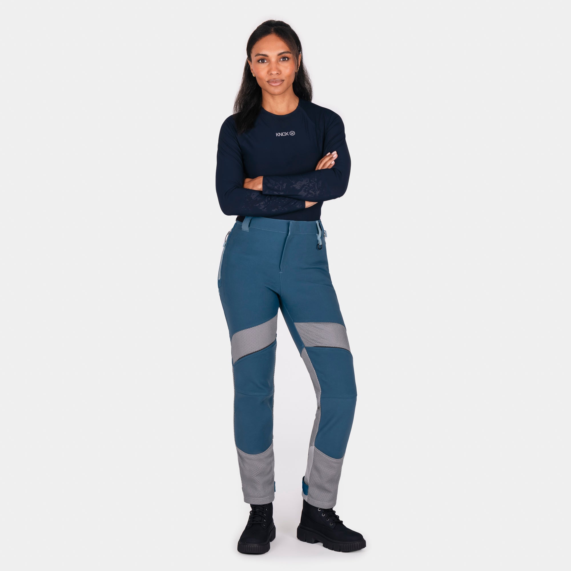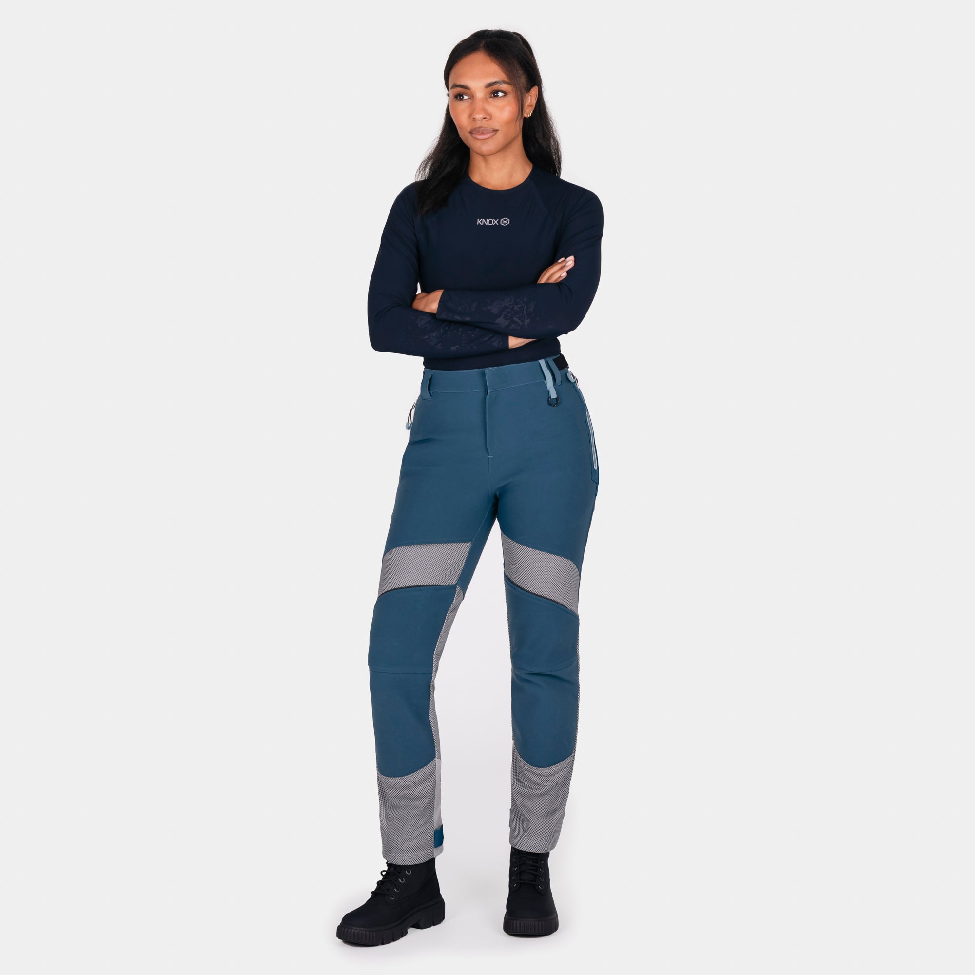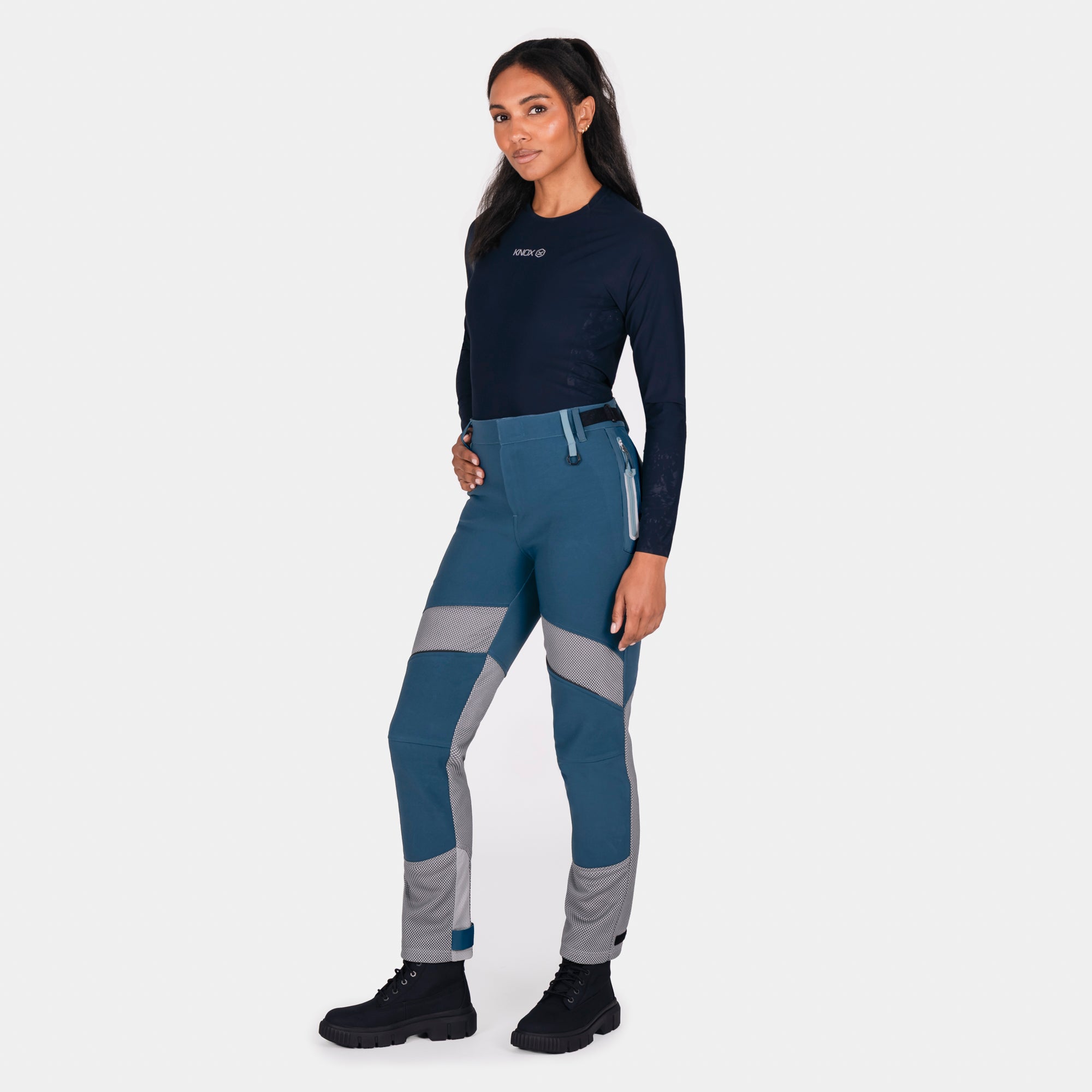 A flattering high-waisted cut provides a sculpted silhouette, while the refined waistband and adjustable side fasteners ensure a secure, comfortable fit. The Lift & Lock® hem adjustment system allows easy wear inside or outside boots, and the magnetic fly closure delivers quick, confident fastening. Designed to integrate seamlessly with any Knox armoured shirt, these trousers form part of a complete protective riding system—keeping armour exactly where it should be.